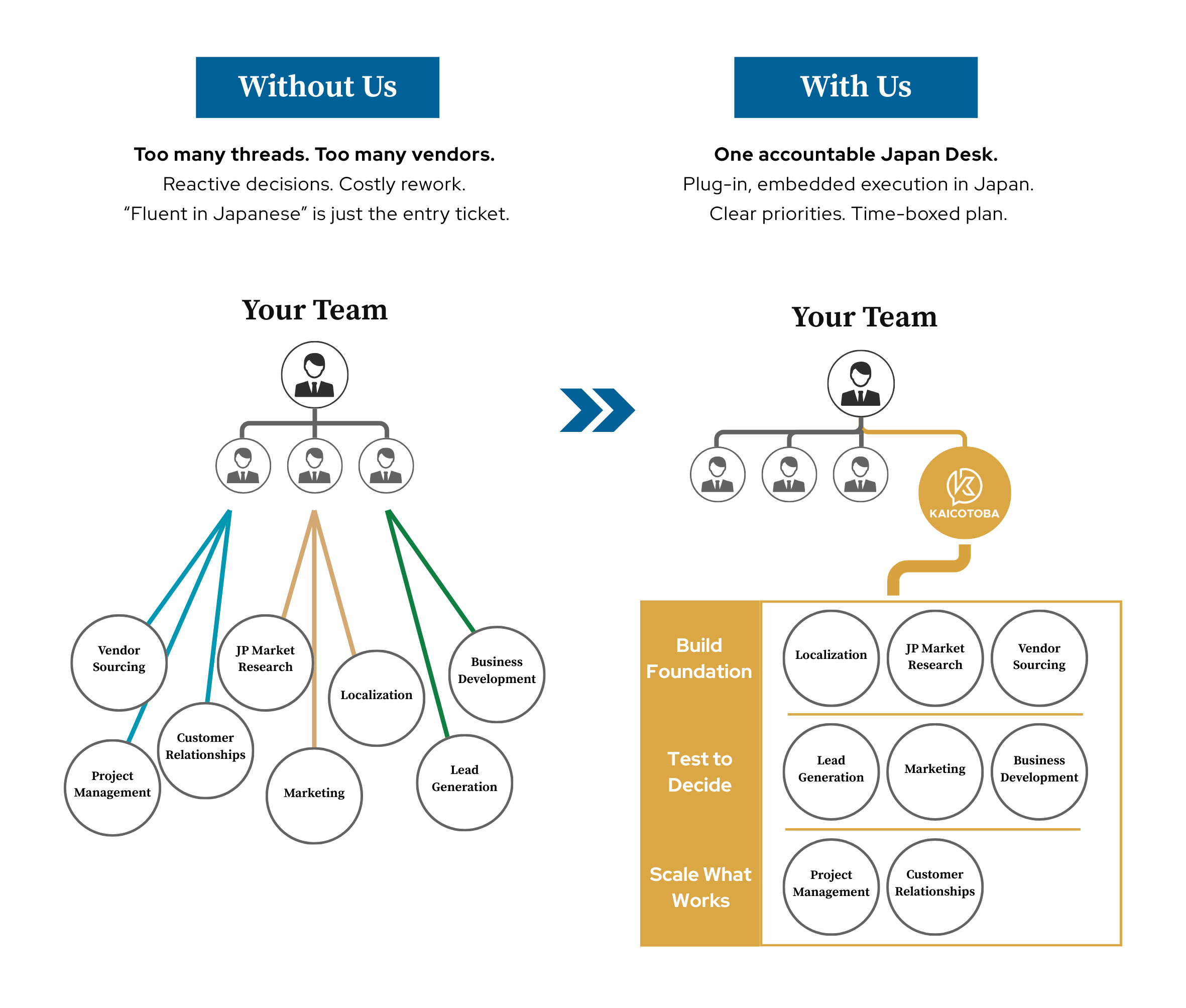 Kaicotoba 的存在就是為了消除這些瓶頸 作為日本執行的負責人, 而不是遠方的顧問。